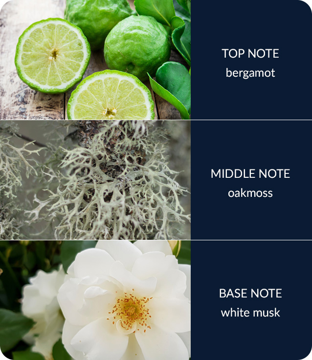 The woody earthiness of bergamot and oakmoss is subtly subdued by the addition of refreshing citrus and a sprinkle of white pepper, all brought together on a base of white musk.